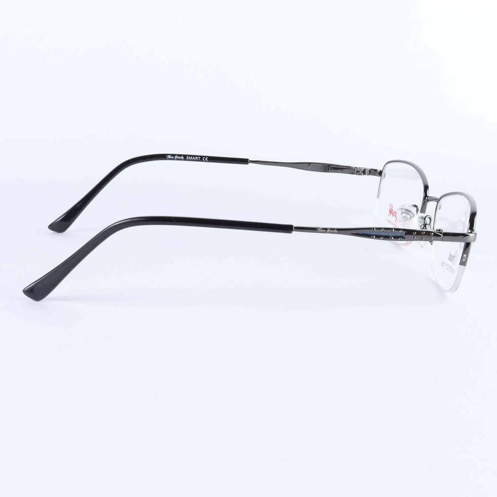 Mysterious steel grey metal frames with a half-rim design and intricate temple detailing.