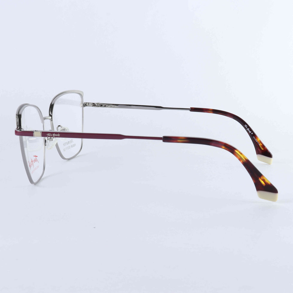 Maroon and silver cat-eye glasses with sleek, sophisticated metal frames. Gleaming gold accents elevate classic sophistication.