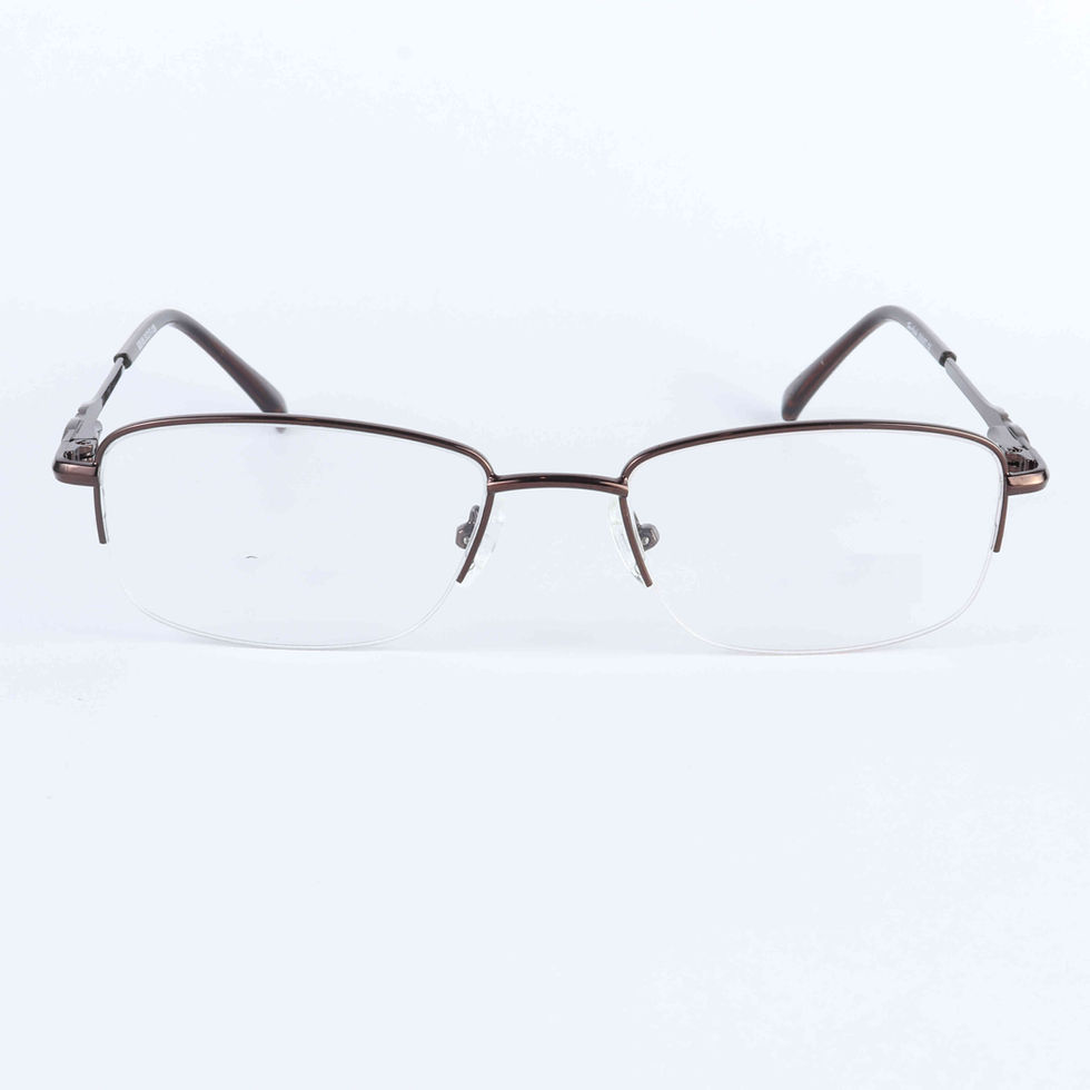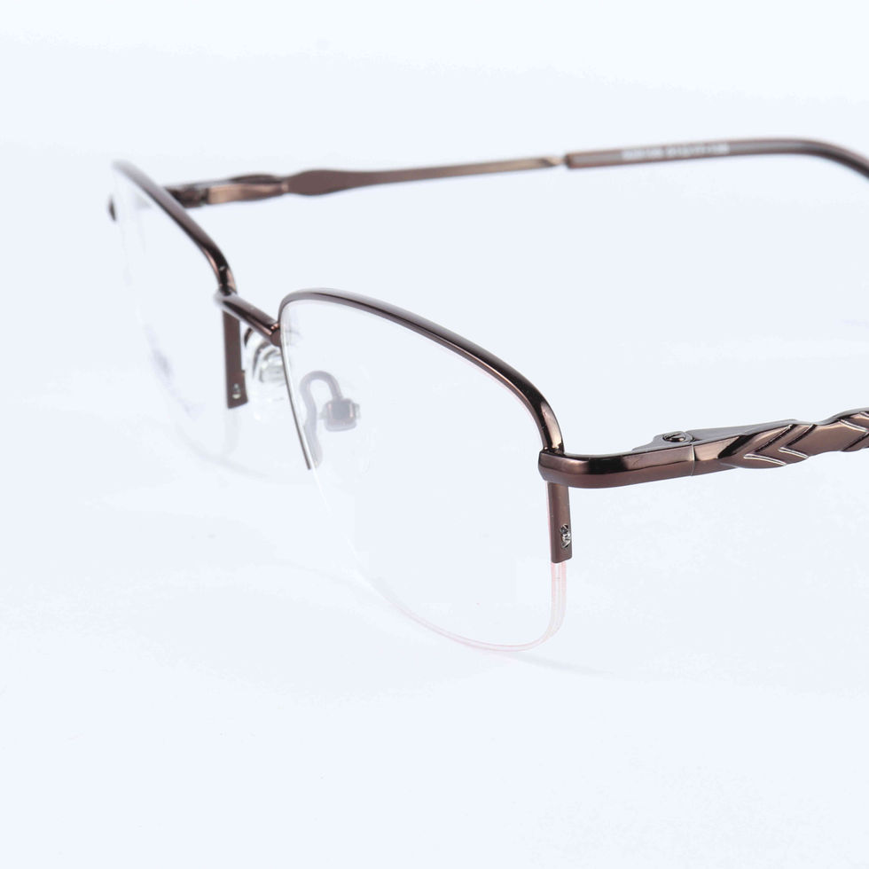 Sleek semi-rimless bronze metal frames with intricate temple detailing, reminiscent of classic eyewear.