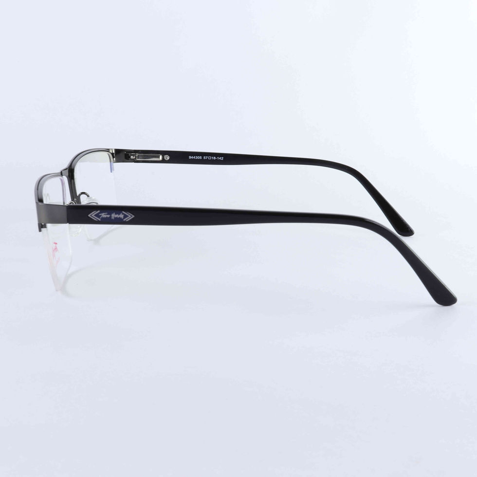 Classic semi-rimless frames in matte black with distinctive silver arrow emblem. Contemporary minimalist design for professional style.